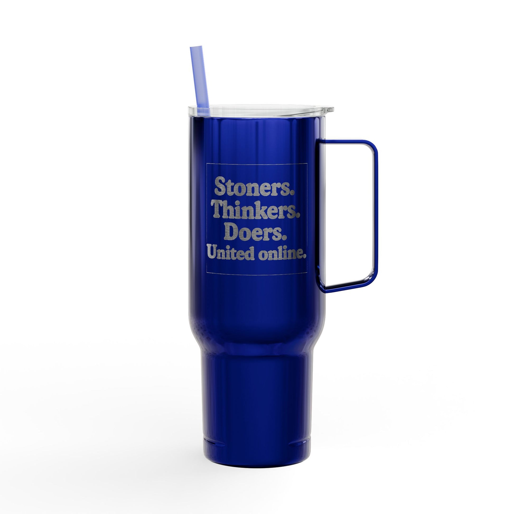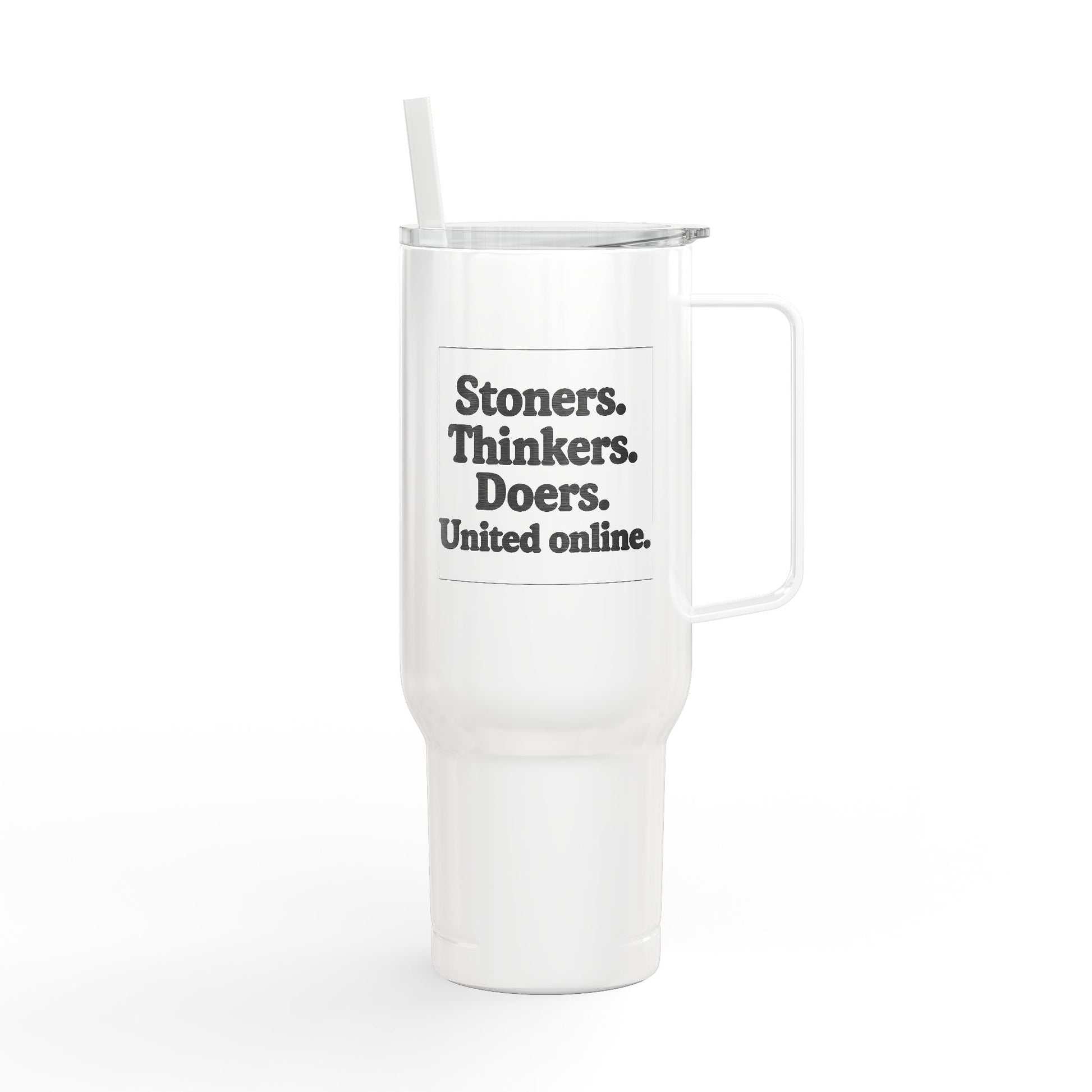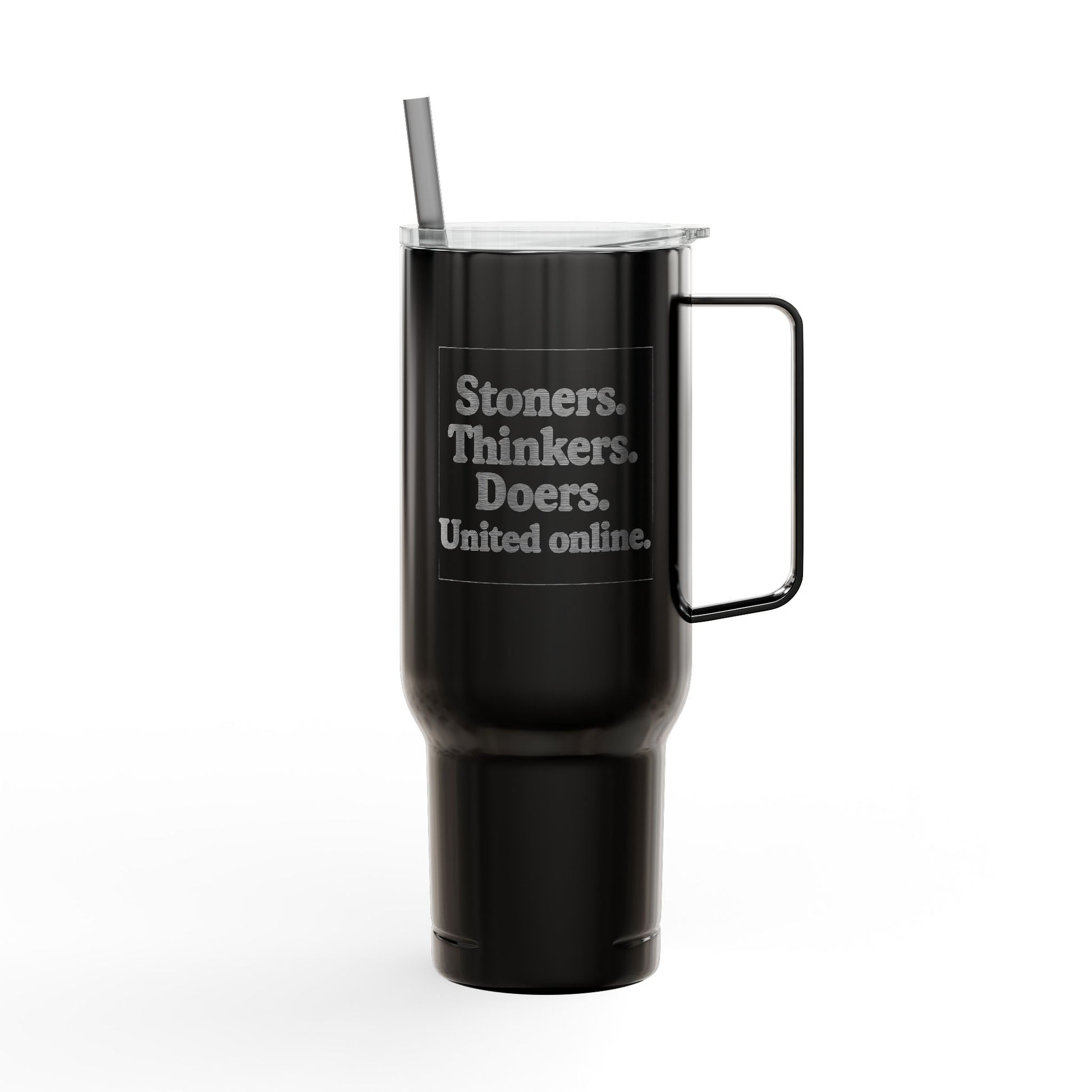 With the mantra "Stoners. Thinkers. Doers. United Online." laser-engraved across its glossy finish, this isn’t just drinkware—it’s a declaration. Sustainably made with 90% recycled stainless steel and 100% recycled plastic, it's got brains and beauty. Double-wall vacuum insulation keeps your coffee hot and your iced tea chill—no matter how wild the day (or night) gets.